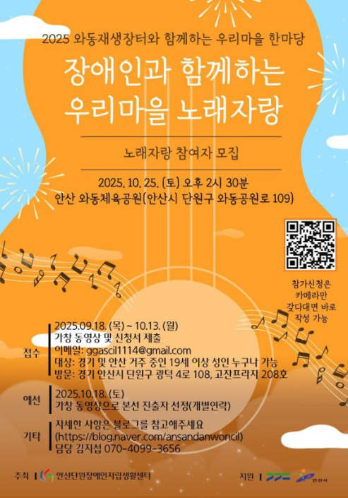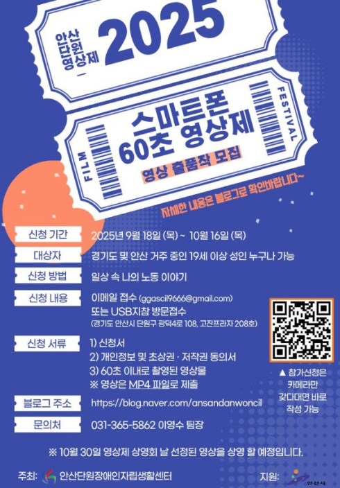 안산단원장애인자립생활센터에서 2025년 ‘장애인과 비장애인이 함께하는 우리마을 노래자랑’ 및 ‘스마트폰 60초 영상제’를 실시하오니 많은 참여 바랍니다.